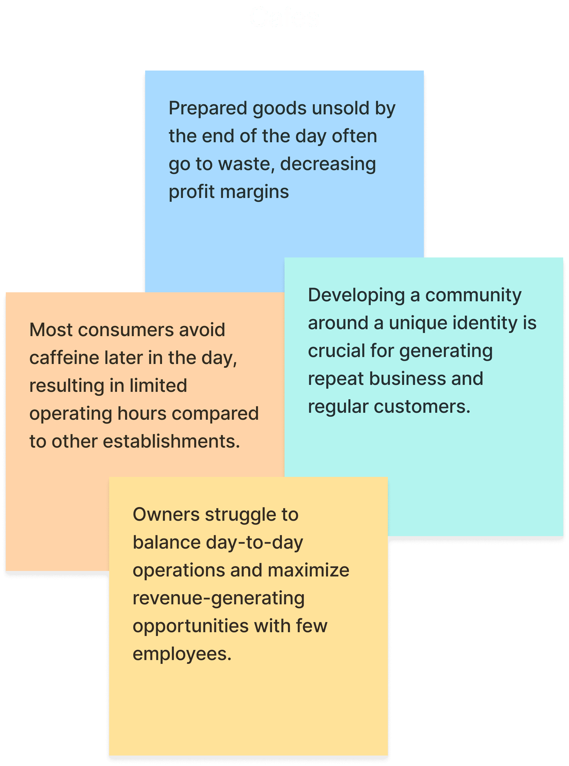 We conducted user interviews with the designathon’s event organizers to understand aspects of student and event organizer perspectives. Given time constraints, we used online research to identify cafe owners' key needs and pain points.